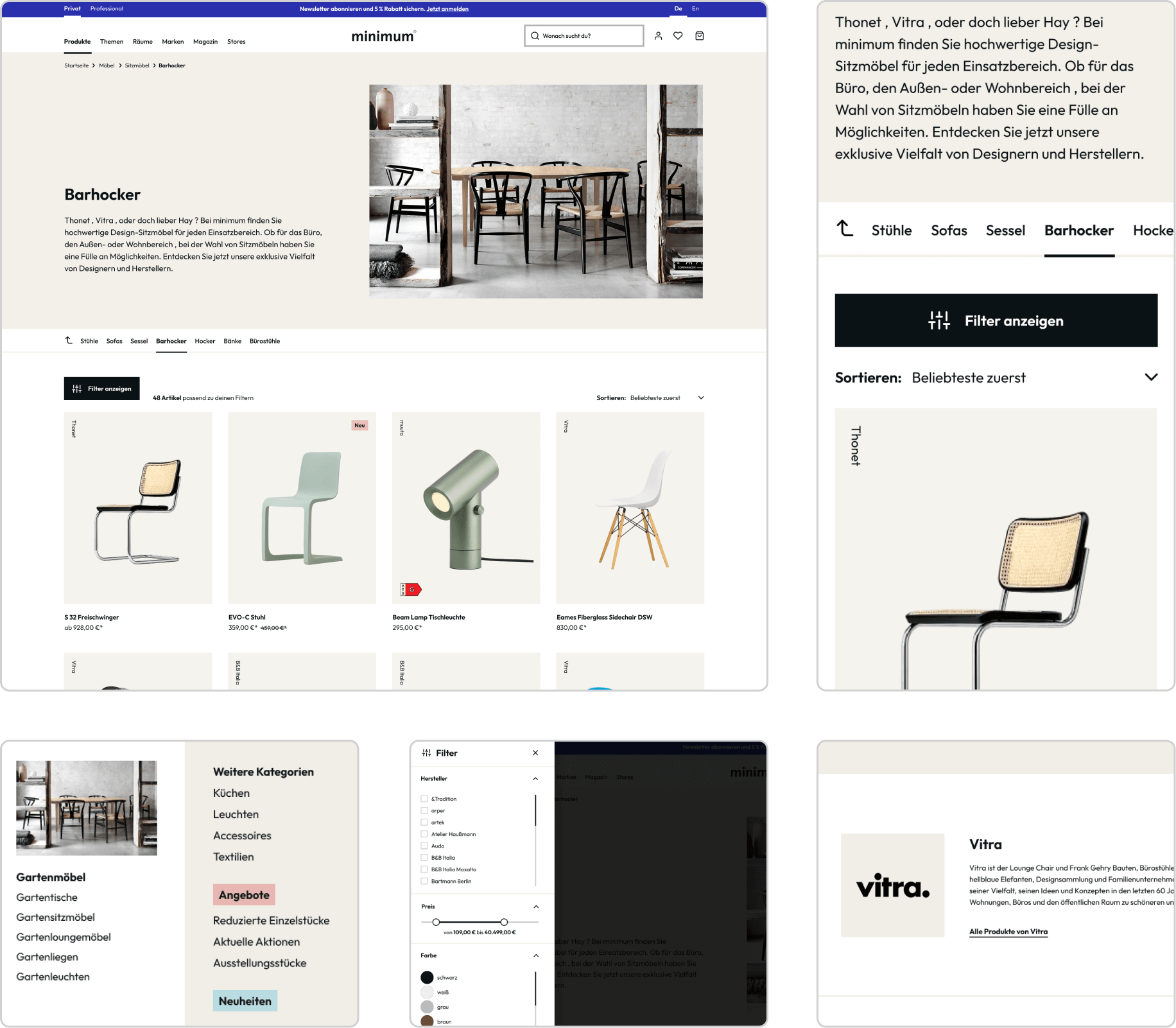 Das Design wurde vollständig neu gedacht und in Figma für alle Viewports (Mobile, Tablet, Desktop) entwickelt. Neben der Startseite wurden u.a. Warenkorb, Checkout, Kundenkonto, Produktdetailseiten, Blog, Hersteller- und Designerübersichten sowie das Menü neu gestaltet.
